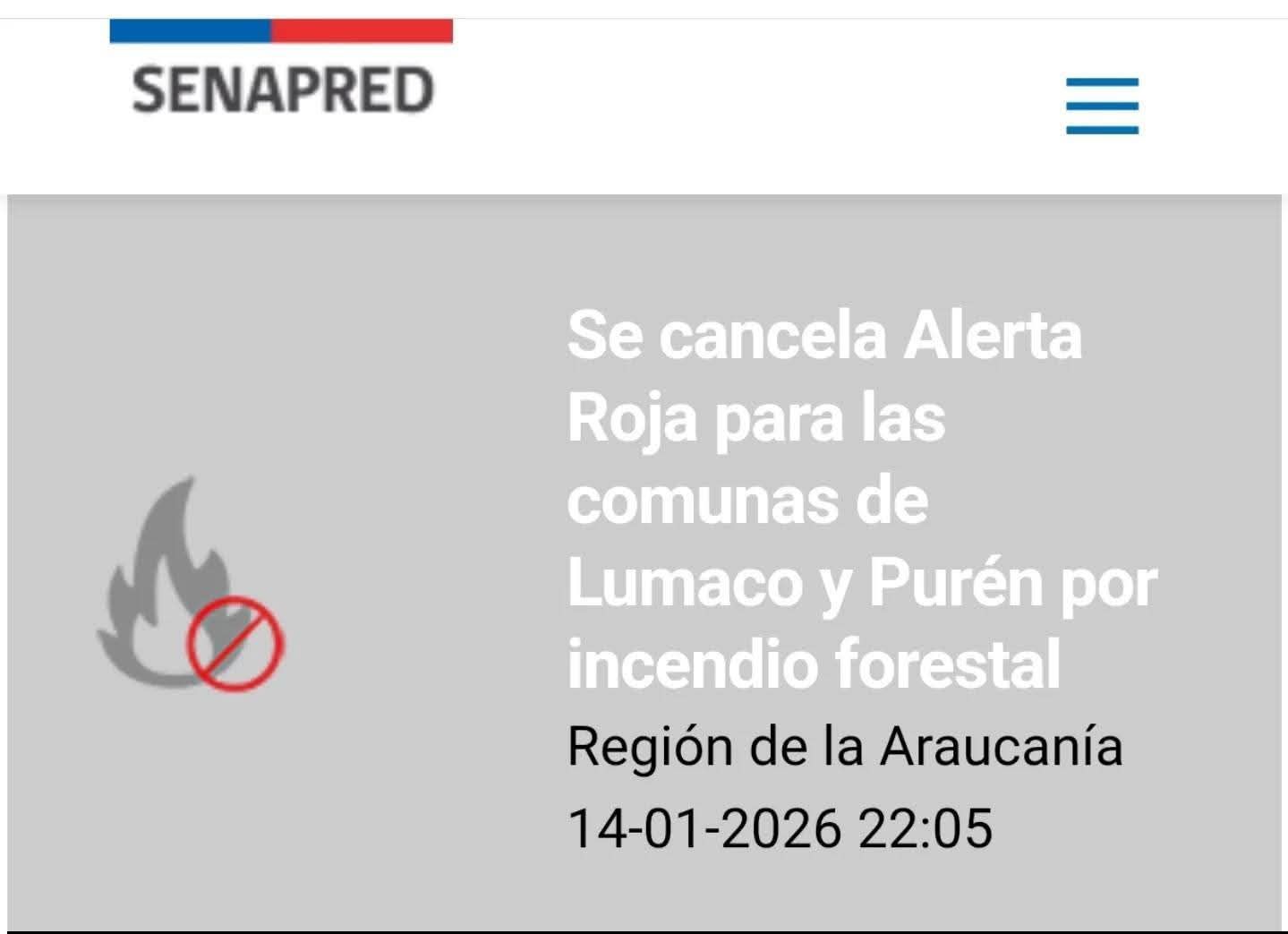 Publicado el 15 de enero de 2026 SENAPRED informo la cancelacion de la Alerta Roja por incendio forestal en las…